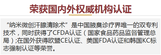 “纳米微创汗腺术” 在2100倍自由镜像缩放支持下,可以辨识患者的臭汗腺分布位置、面积大小、数量多少等情况,精准的定位,汗腺无任何遗漏精准探测定位消融后吸出,按照腋下皮纹走向仅在腋下褶皱处开一个不到2-3毫米的小口,同时将腋下大汗腺完全消融稀释后,吸抽取出来,并破坏大汗腺再生能力。从根本上切断异味产生的根源。